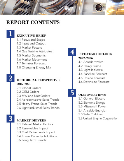 Scope of coverage: Data on current market share (installed base) and projected sales by unit are presented for the following OEMs: GE Power, Siemens Energy, Mitsubishi Power, Ansaldo Energia, Baker Hughes, Solar Turbines, United Engine Corp, IHI Power Systems, Kawasaki Heavy Industries, KMPO, MAN Turbo, Zorya Mashproekt, Mapna, and Doosan.